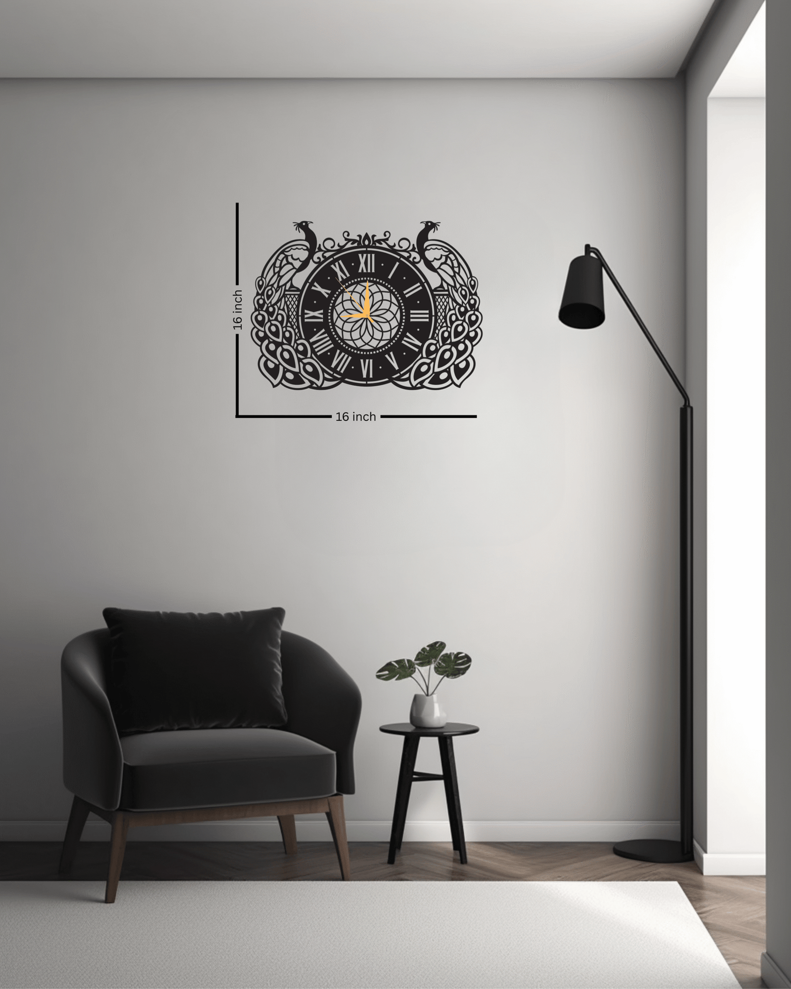 Adorn your wall with the regal beauty of The Peacock Majesty Clock. This exquisite timepiece is more than a way to tell time—it’s a celebration of nature’s artistry. The clock features a striking laser-cut design with two elegant peacocks, their fanned tail feathers forming a symmetrical frame around a classic Roman numeral face.